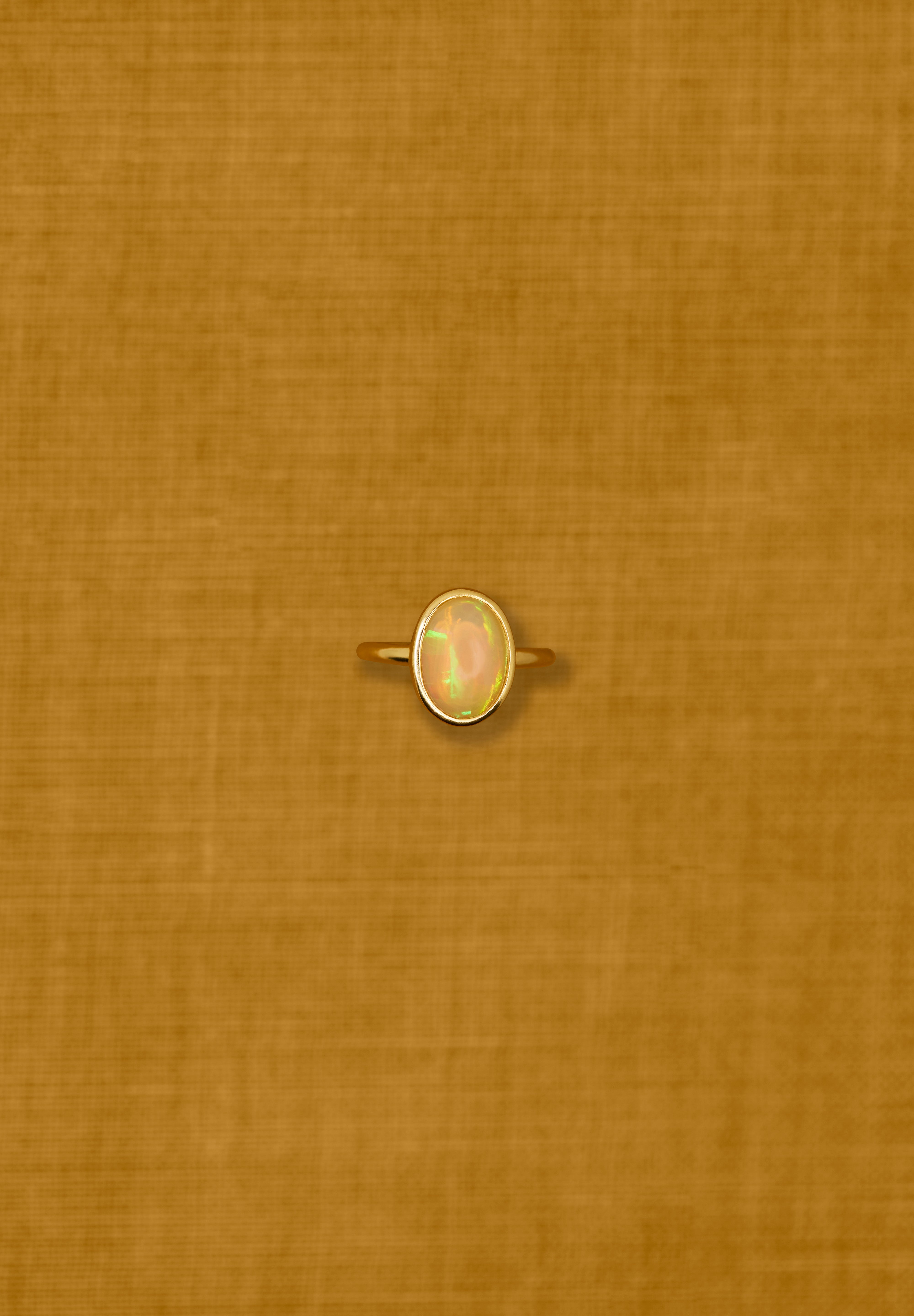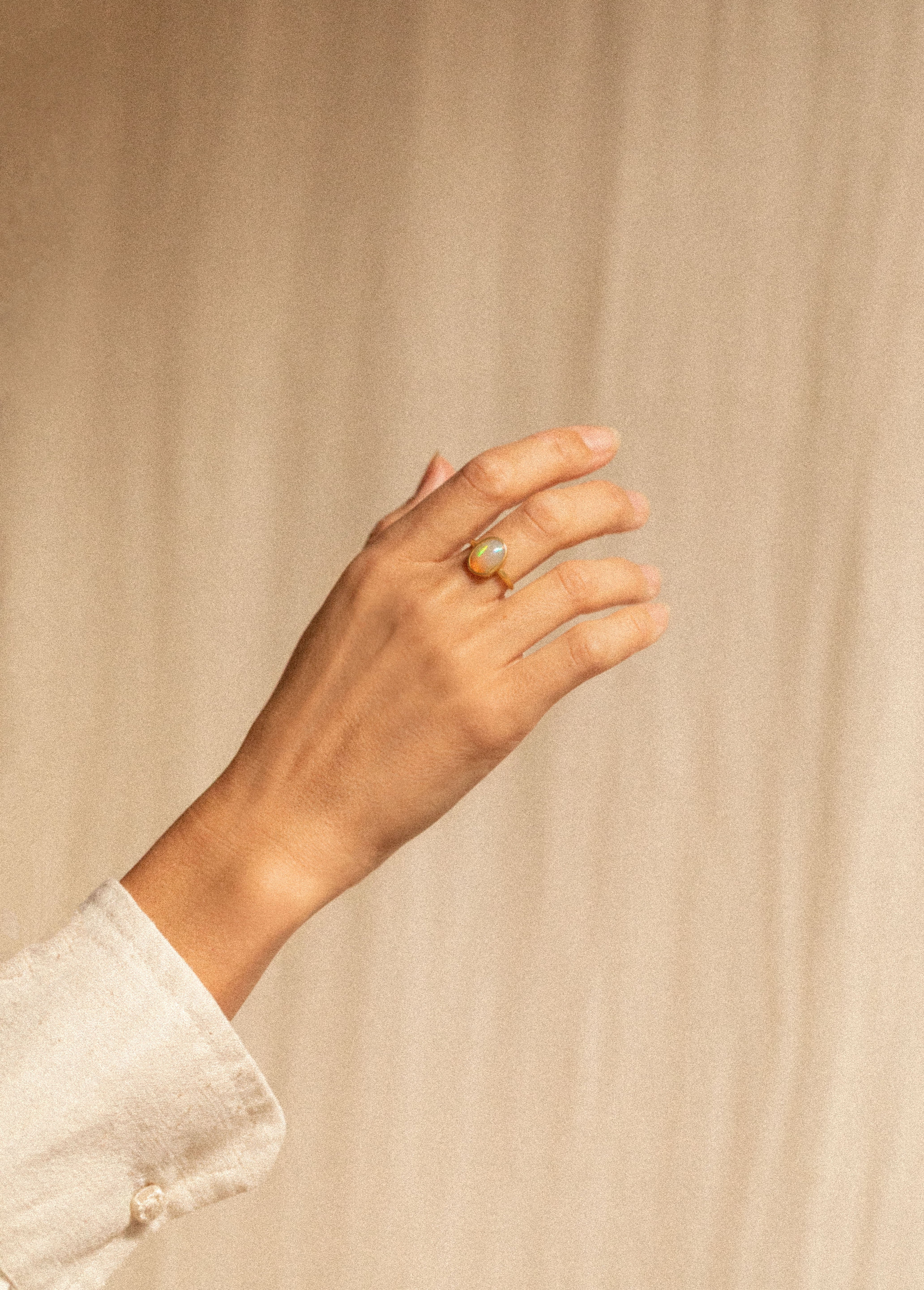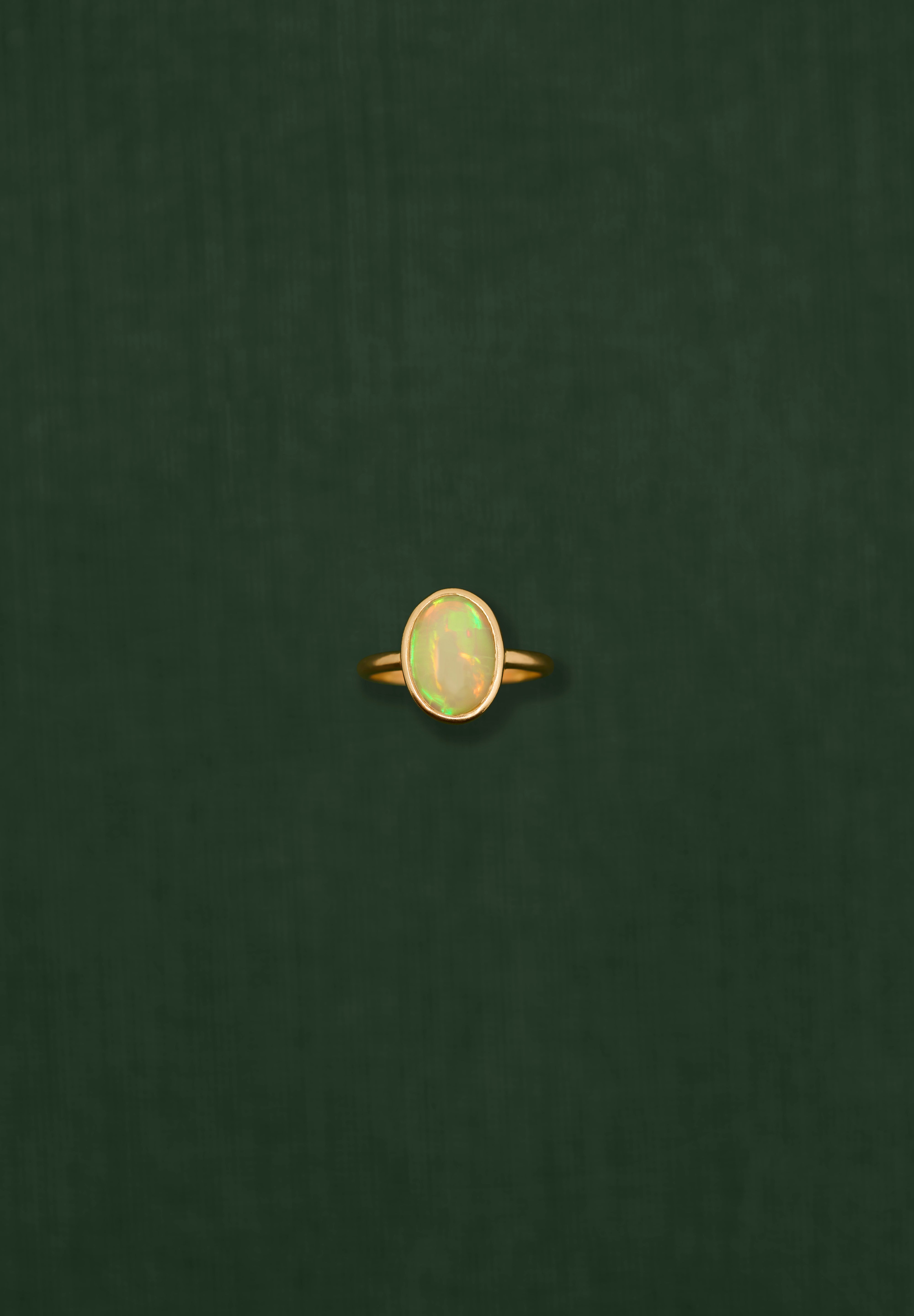 This one-of-a-kind ring features a brilliant white opal set in a smooth gold bezel. Its timeless design ensures comfort for everyday wear. Perfect for any October born person in your life.