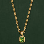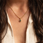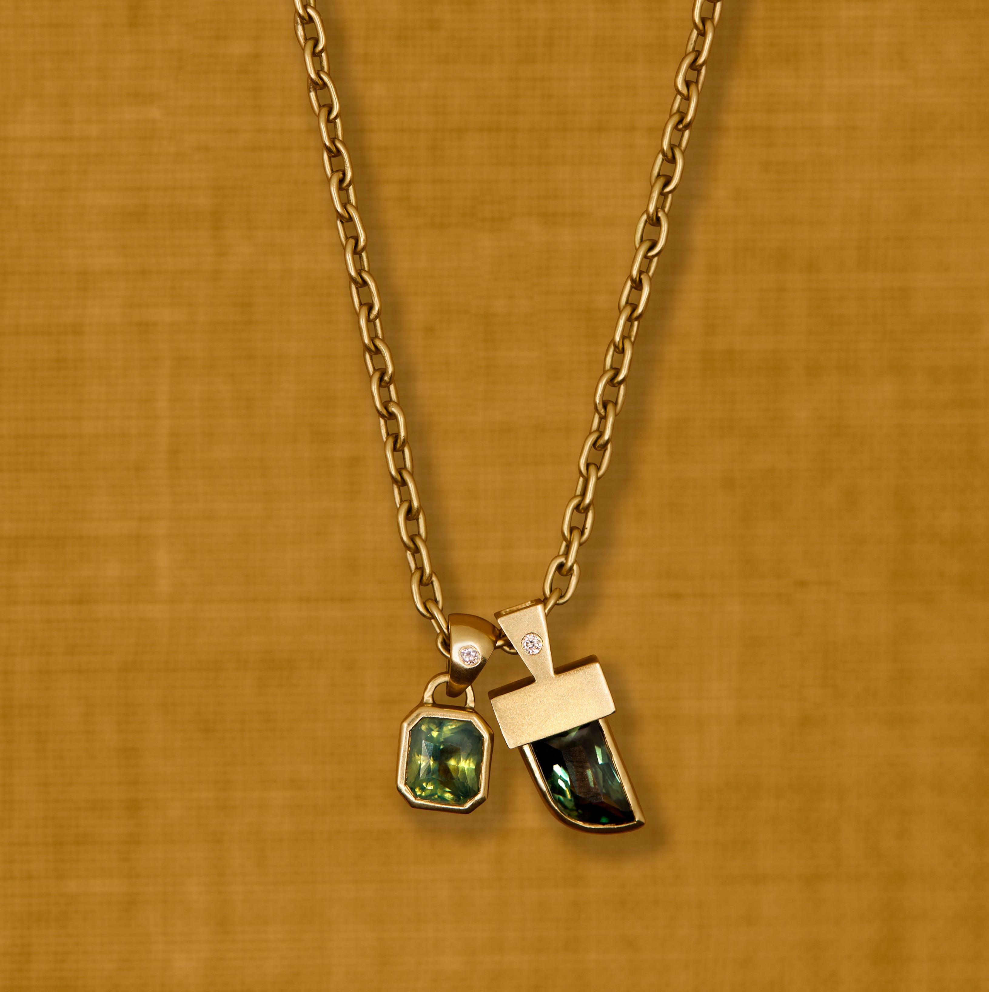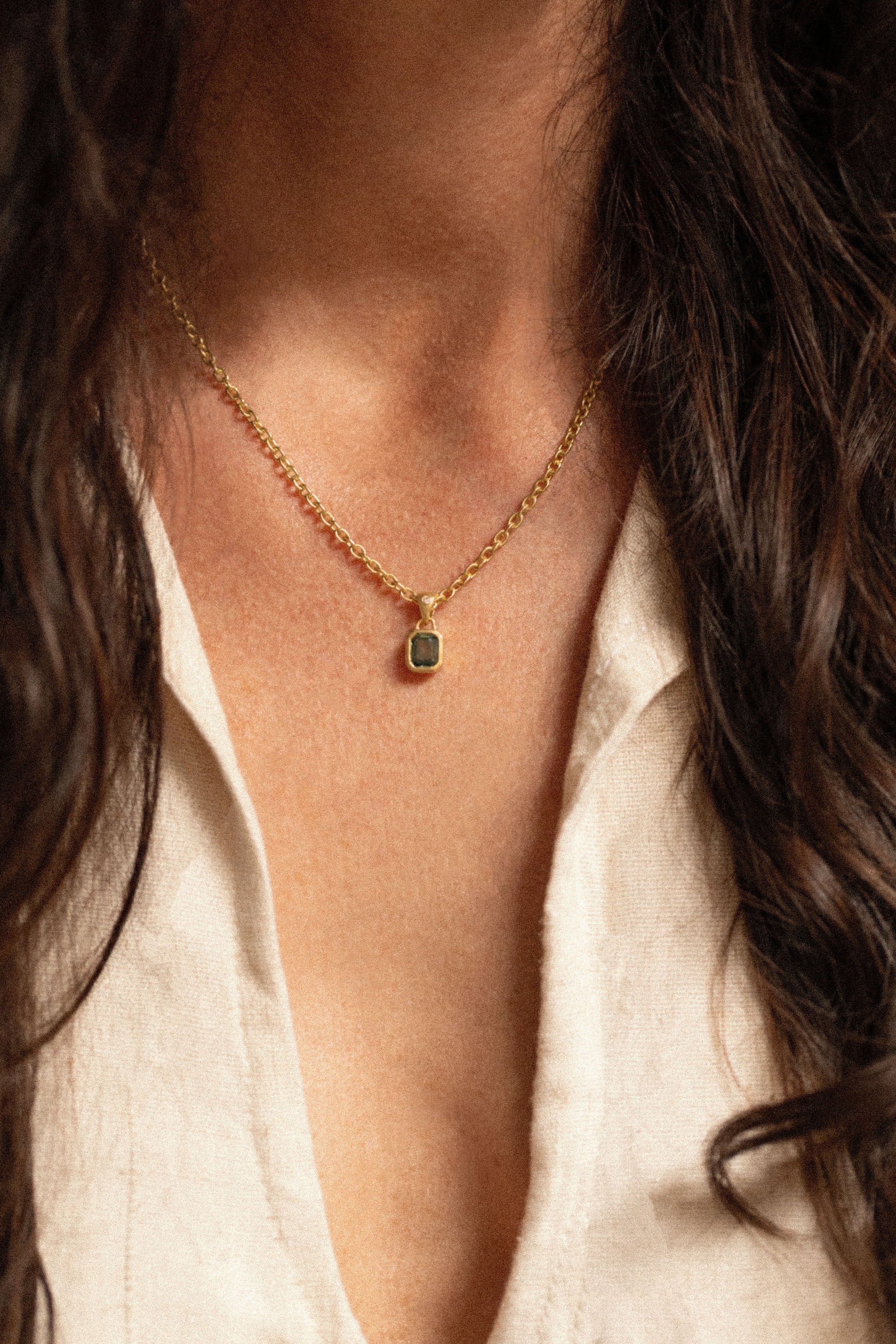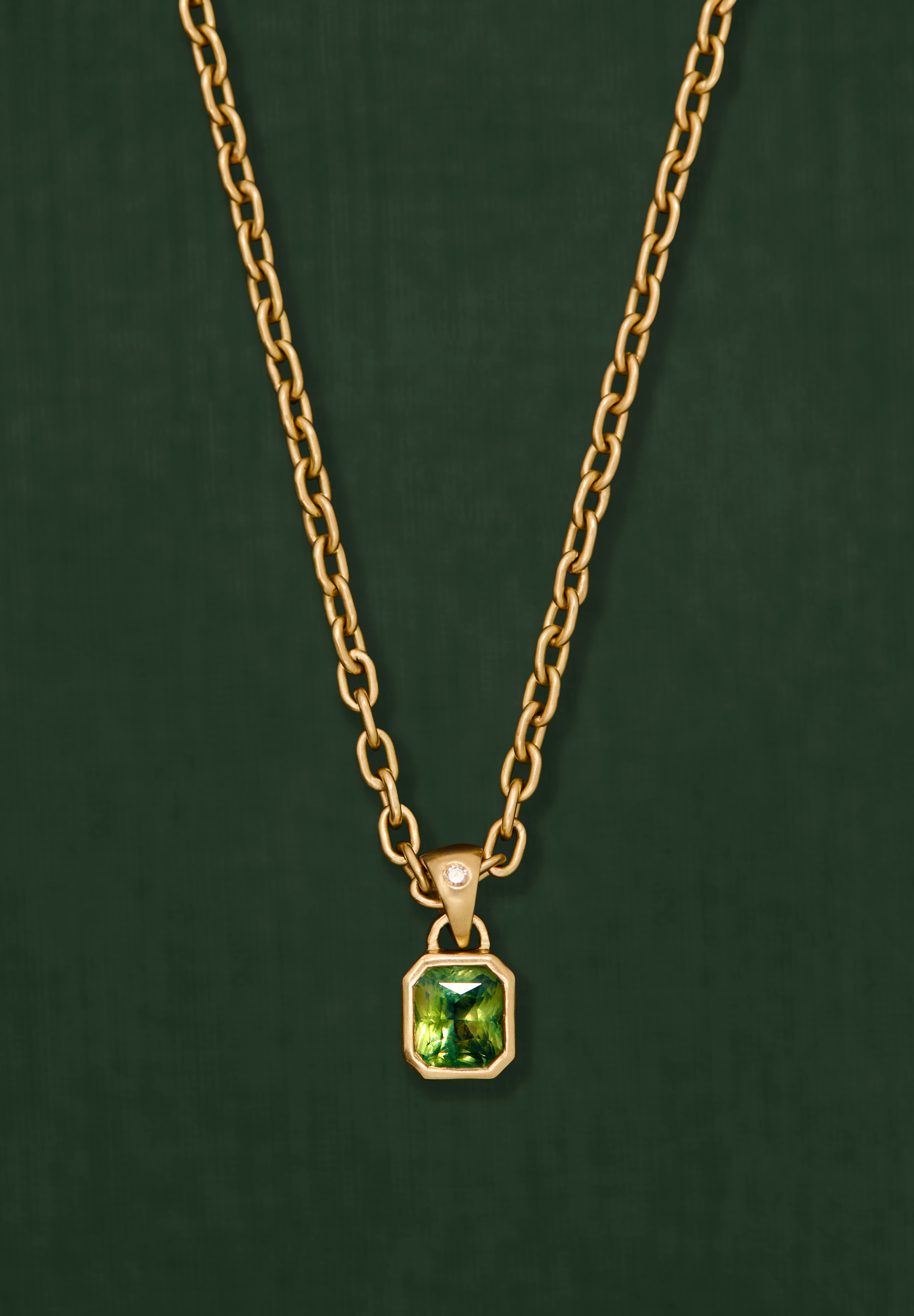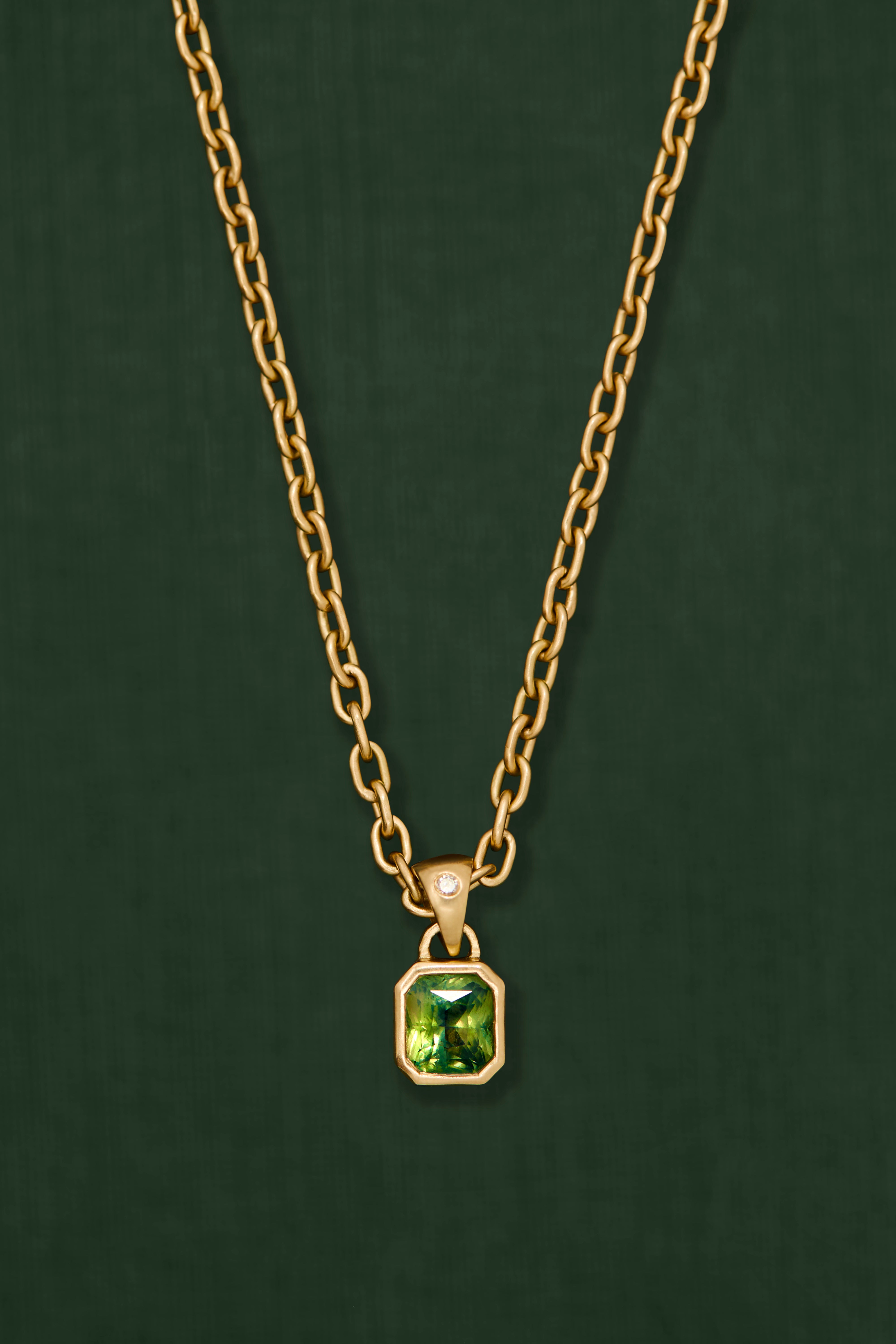 An emerald-cut green sapphire is bezel-set in gold with a single diamond accent at the bail. Refined, earthy, and quietly luminous.