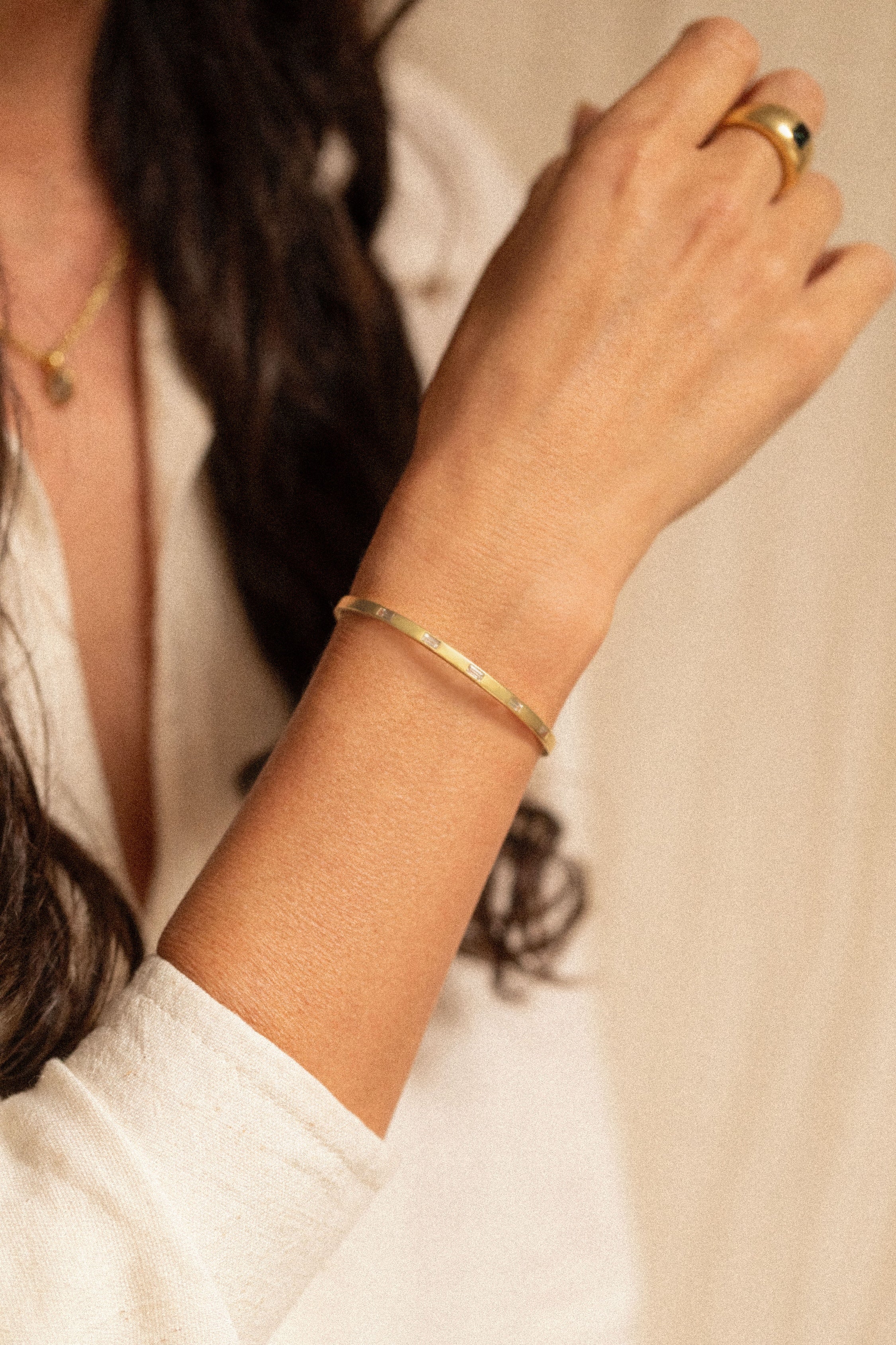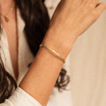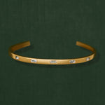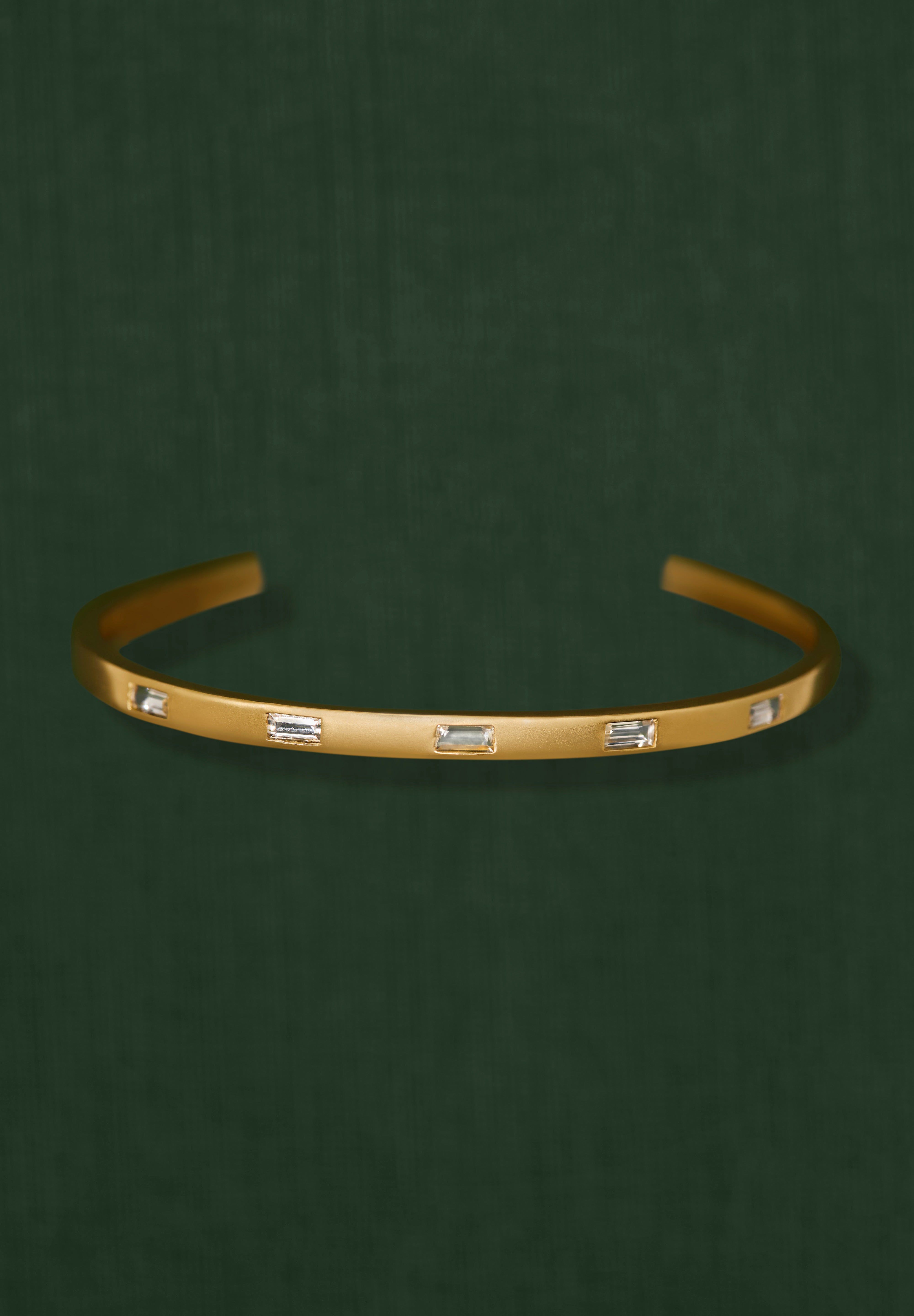 This open cuff bracelet is set with a row of baguette cut white sapphires. Its minimalist silhouette makes it perfect for everyday elegance or effortless stacking.