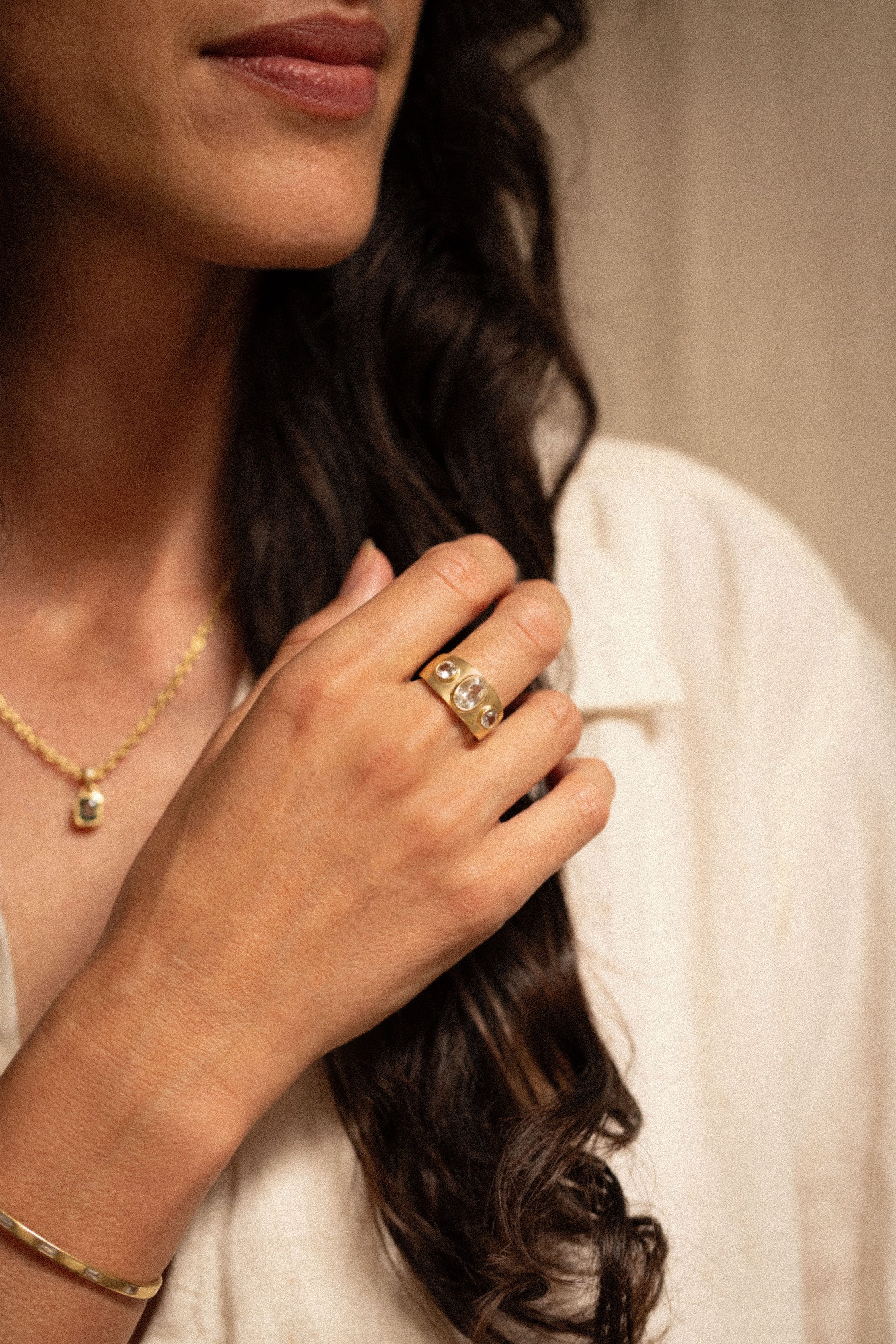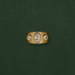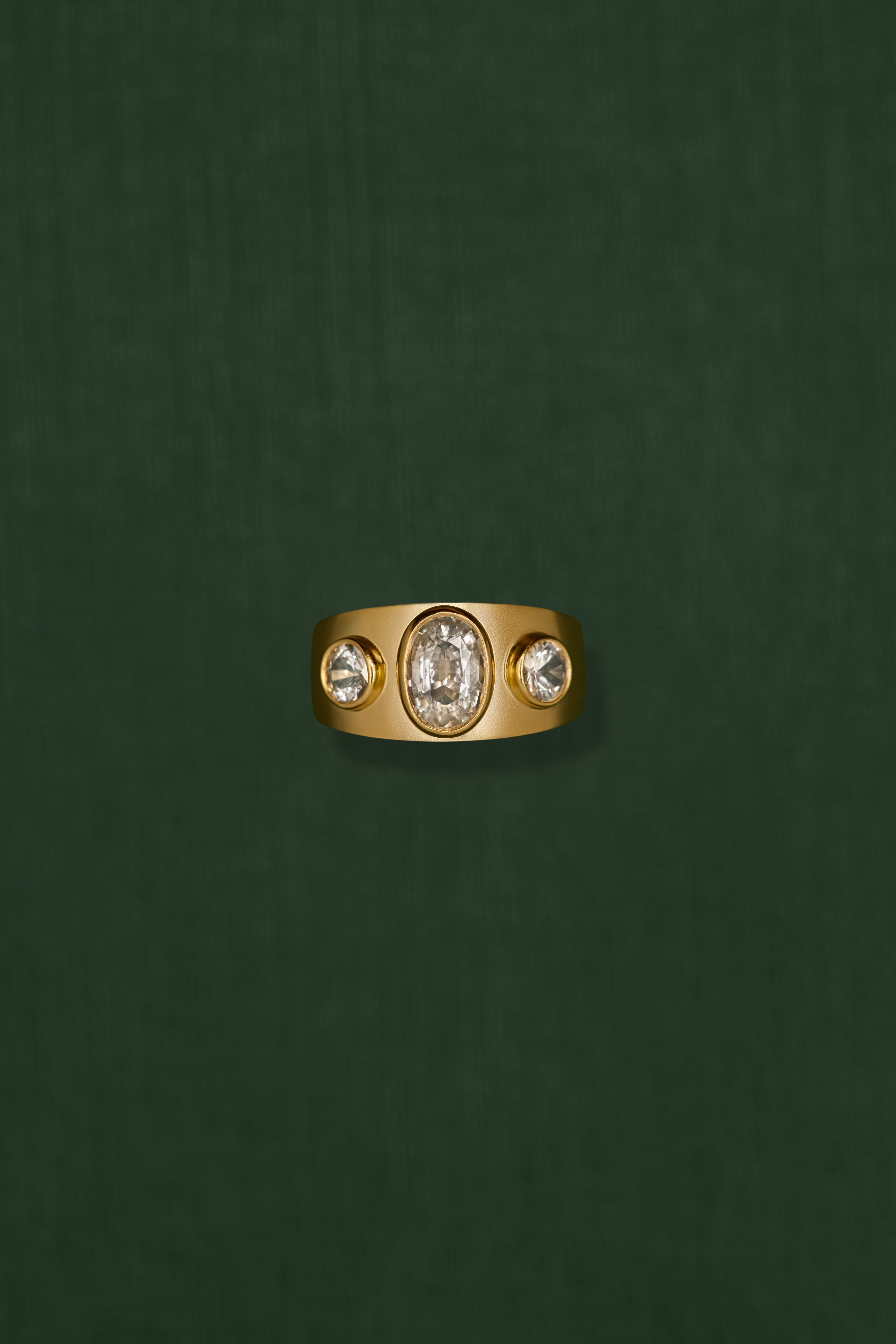 Three white sapphires on a thick gold band.