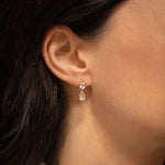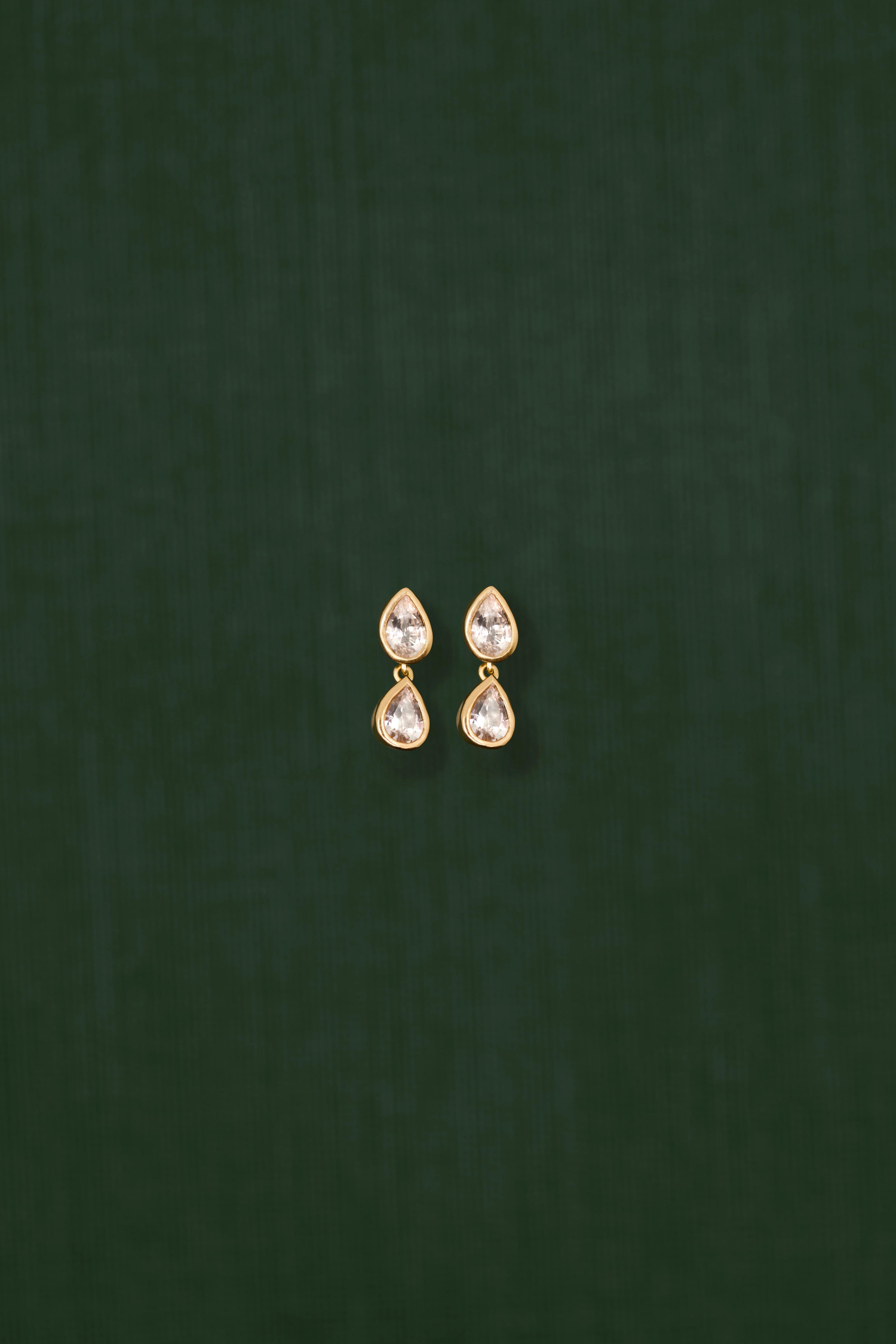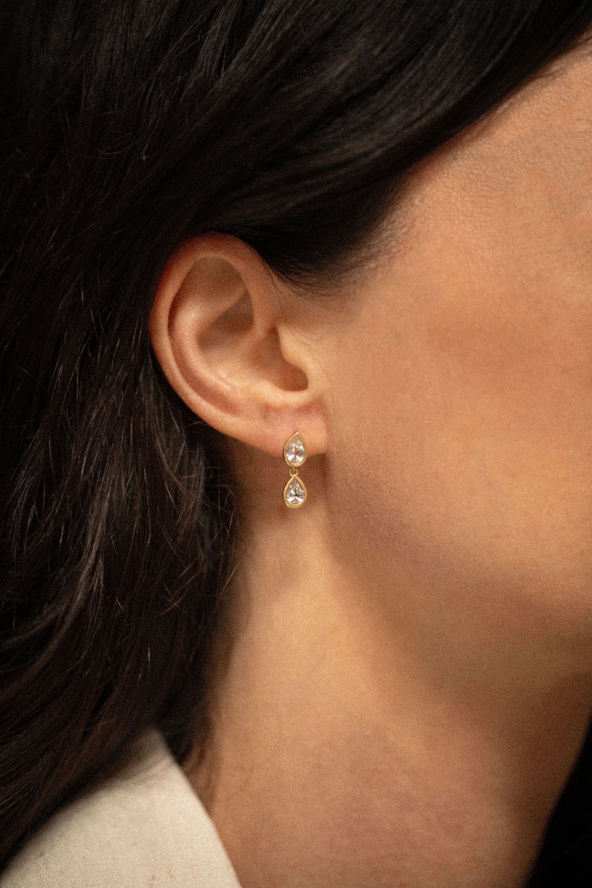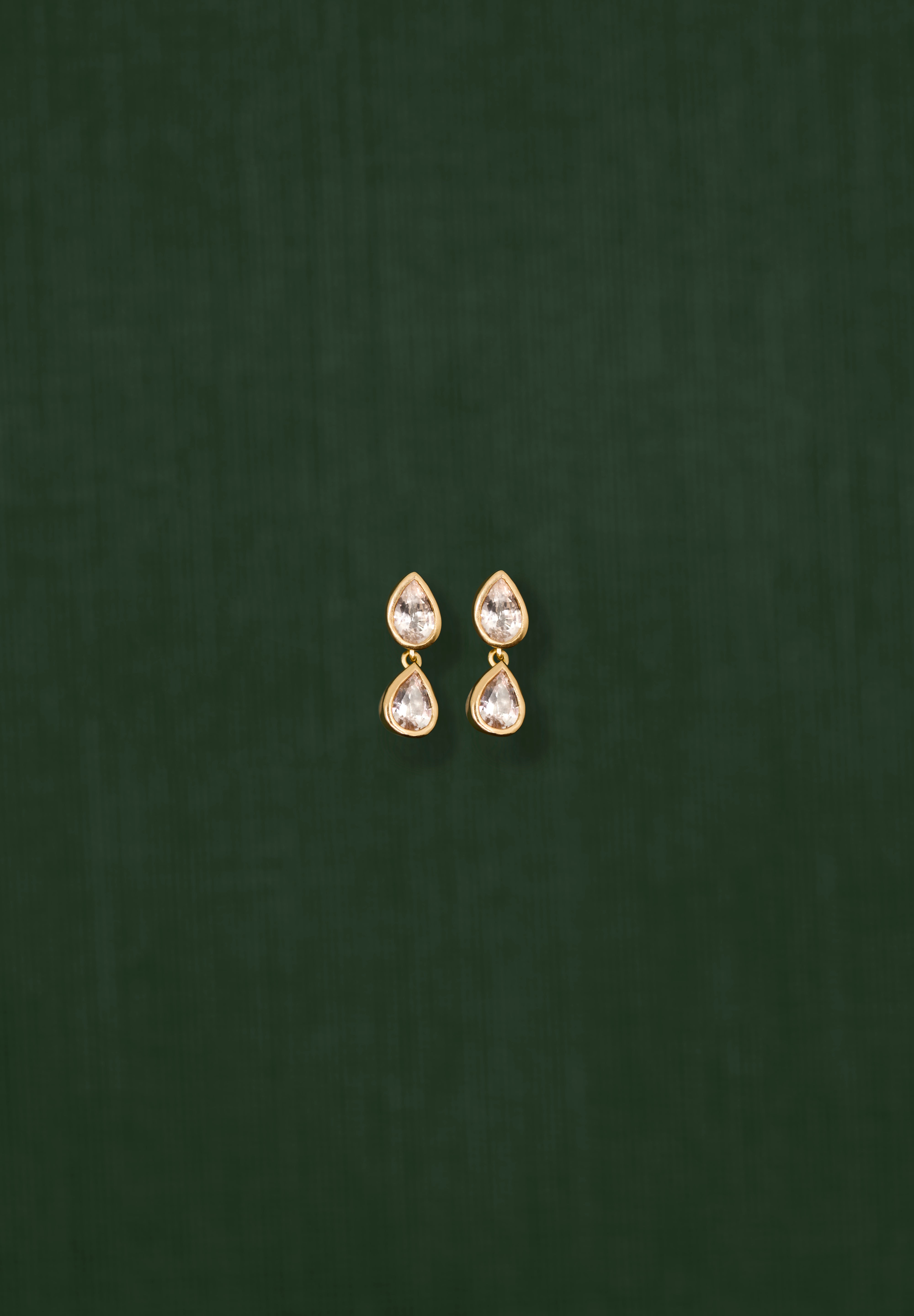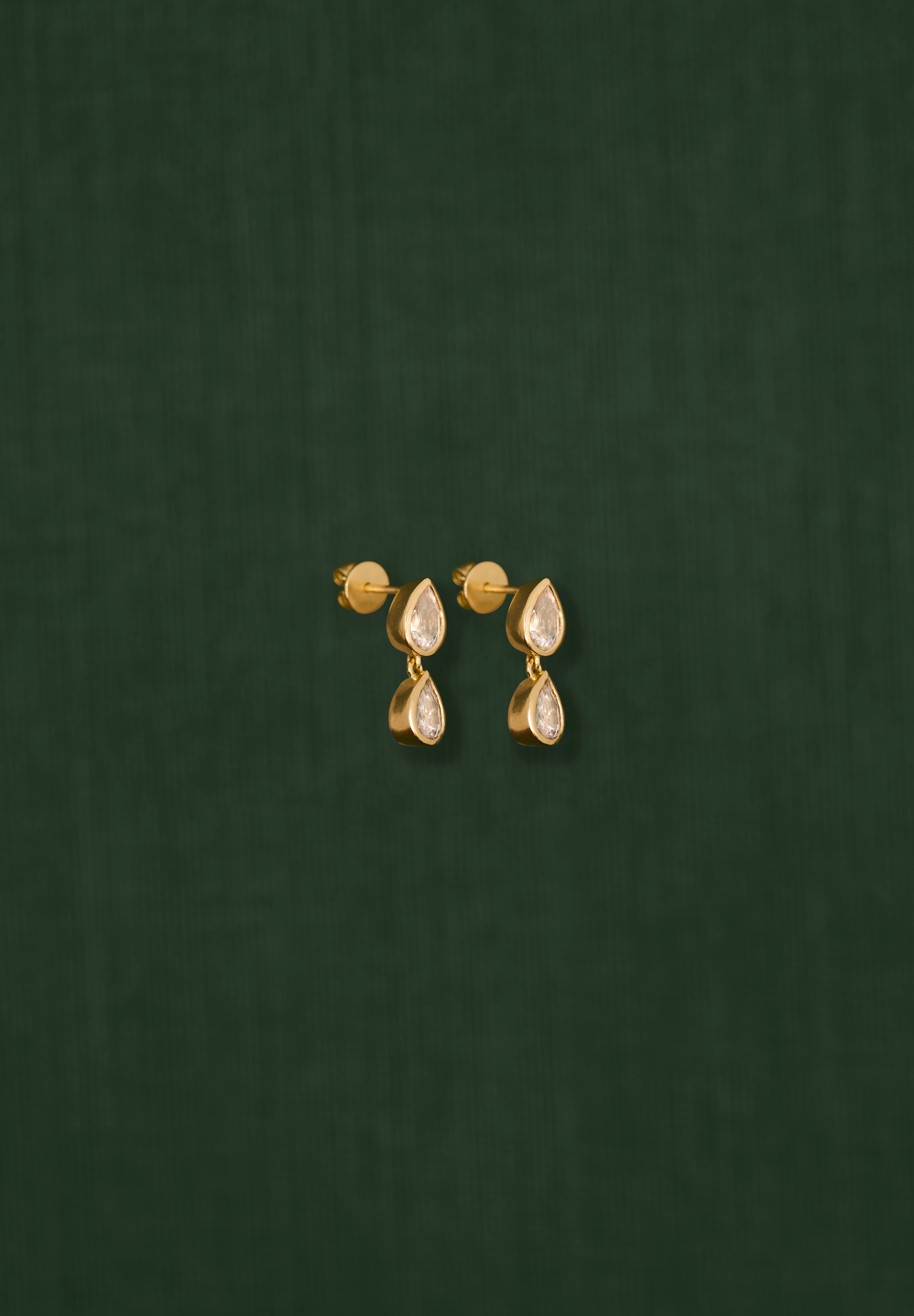 These handcrafted earrings feature two pear-cut white sapphires set in rich 18K gold, creating a graceful drop silhouette. Their delicate movements make them the perfect finishing touch for both everyday refinement and special occasions.